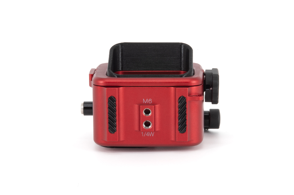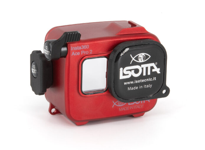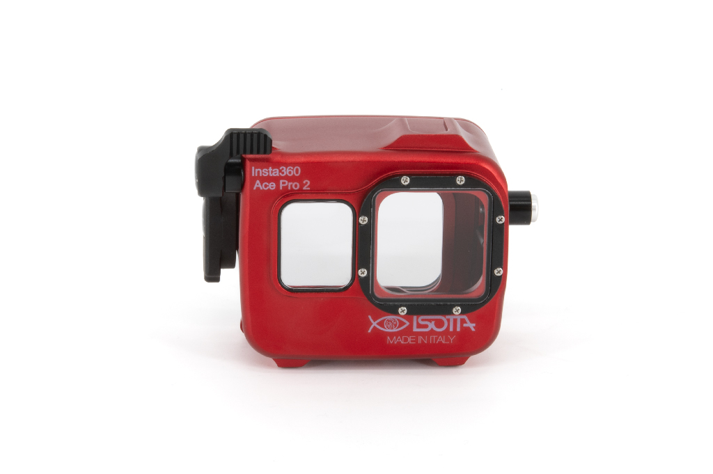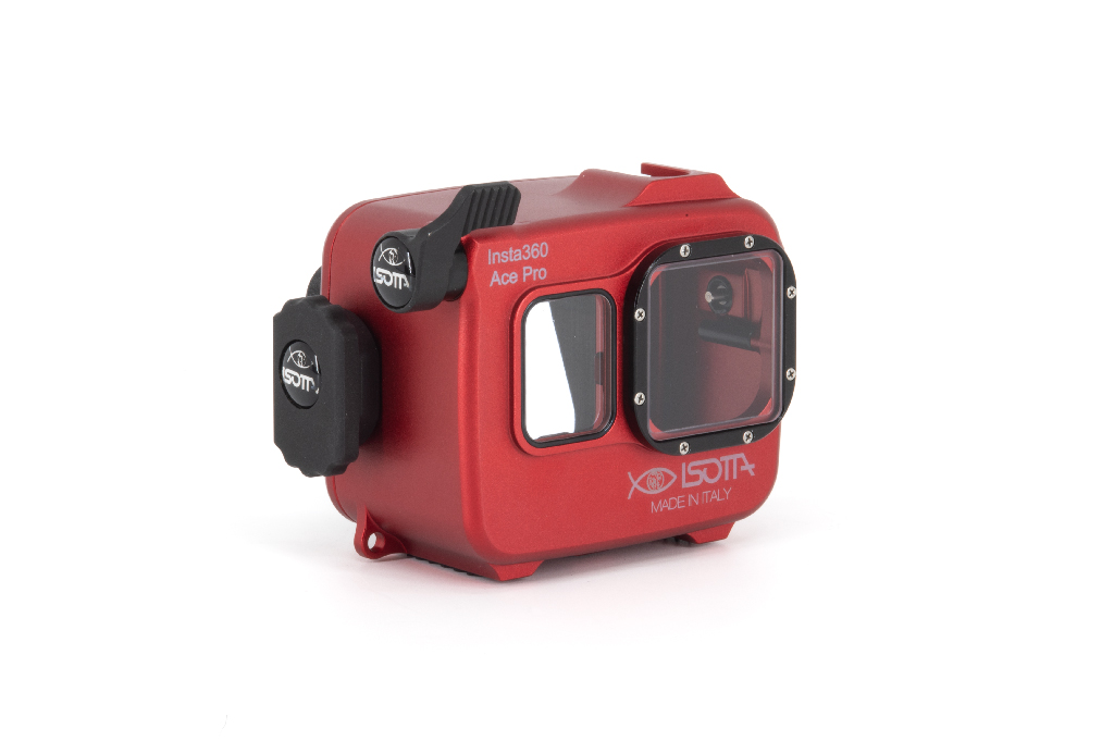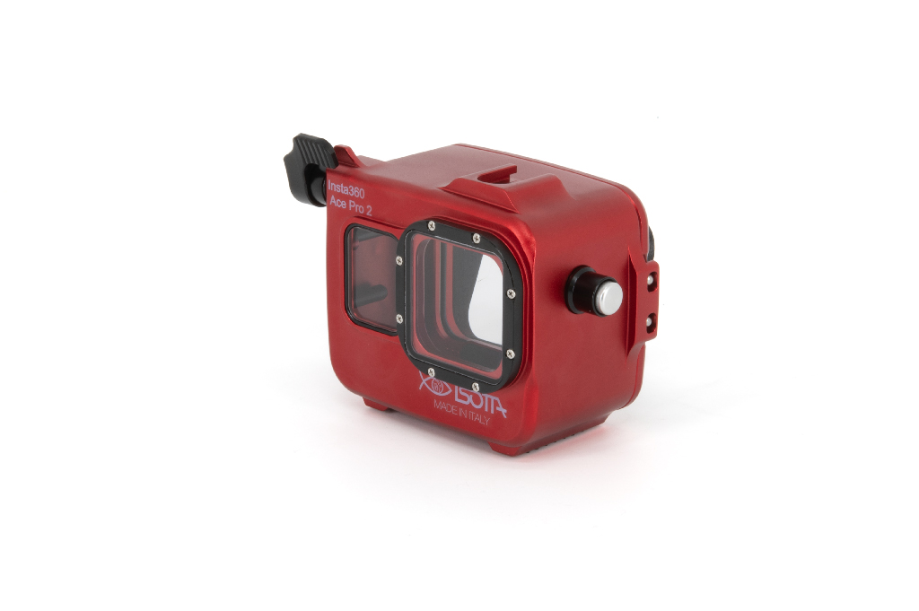 Carcasa profesional de alta resistencia fabricada en aluminio anodizado de color rojo, diseñada específicamente para las cámaras de acción Insta360 Ace Pro y Ace Pro 2. Este equipo permite una profundidad de trabajo de hasta 200 metros. La estructura cuenta con un cuerpo trasero totalmente desmontable del frontal, un pomo de cierre de seguridad manejable con una sola mano y botones de aluminio. Incorpora un cristal visor de gran tamaño para la pantalla trasera y doble junta tórica (O-Ring) en todos los botones y piezas extraíbles para garantizar la estanqueidad. Incluye una zapata fría superior para accesorios (luces de enfoque), así como orificios M6 y 1/4W en la base para montaje en trípodes o brazos. Sus pies están cubiertos de goma para asegurar la estabilidad en superficies diversas.