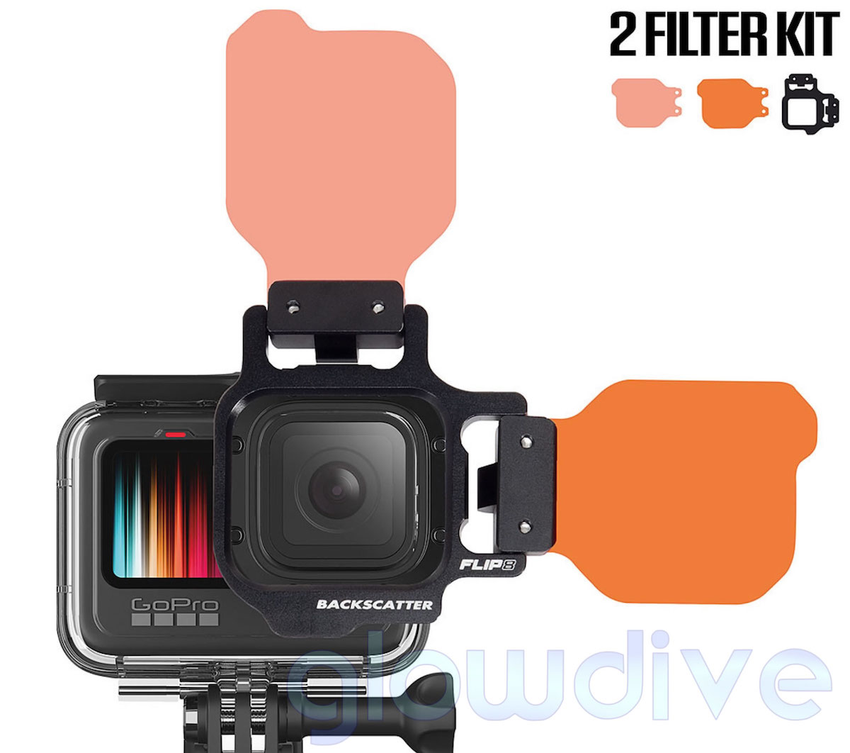 El sistema Flip Dos viene con 2 filtros: Uno con un tono naranja especialmente optimizado para profundidades de 7 a 12 metros y otro para aguas más profundas de 12 a 24 m. El tono de los filtros se ha optimizado para cubrir con solo dos filtros el rango de profundidades que antes se cubría con tres filtros.