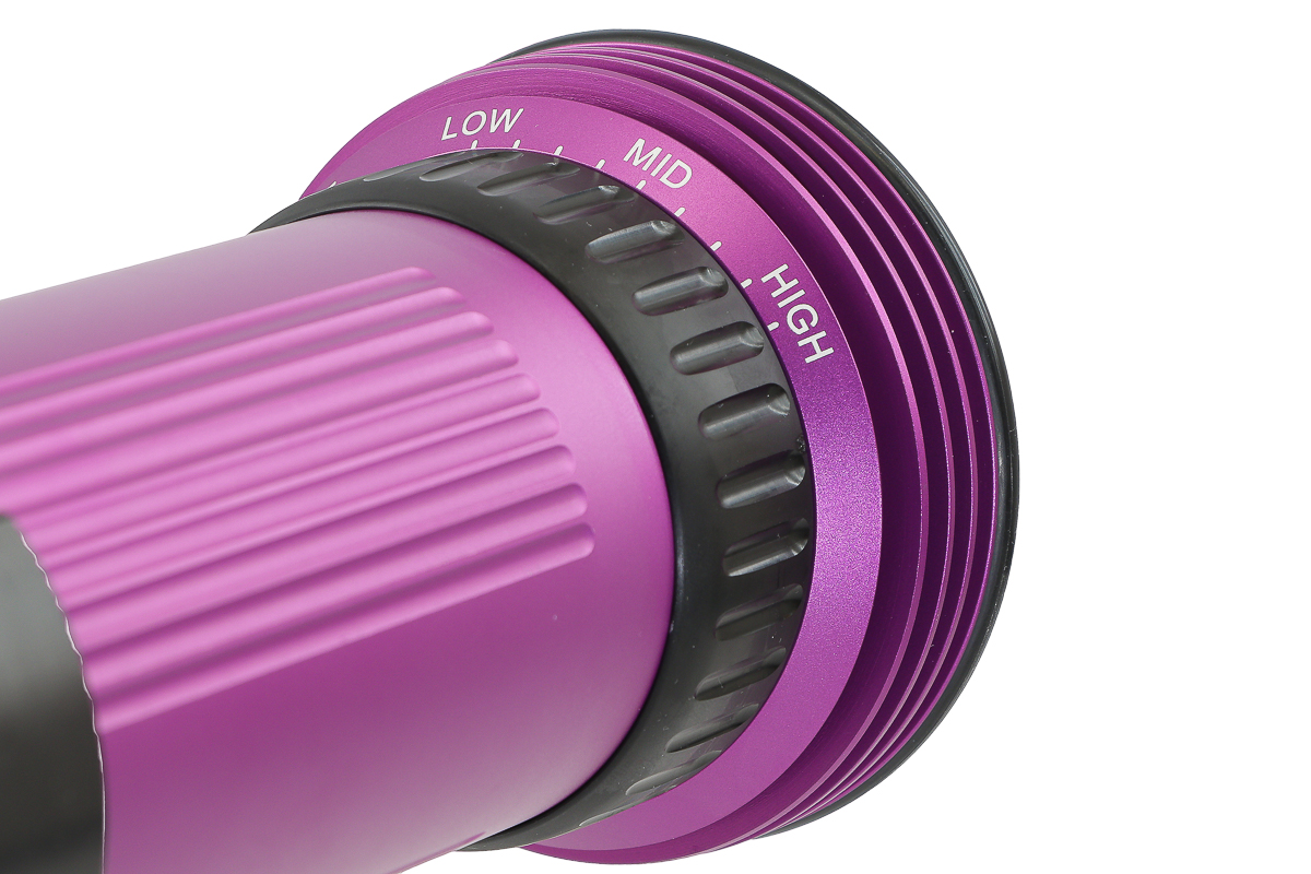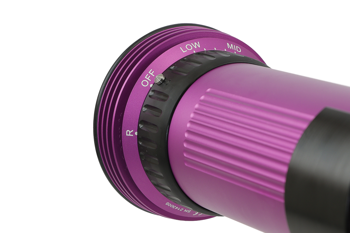 El foco utiliza un reflector cuidadosamente diseñado y una lente de cúpula para lograr un haz muy amplio y homogéneo, sin puntos calientes ni irregularidades. El ángulo de haz (ancho total a media potencia) es de 110° bajo el agua (120° en aire).