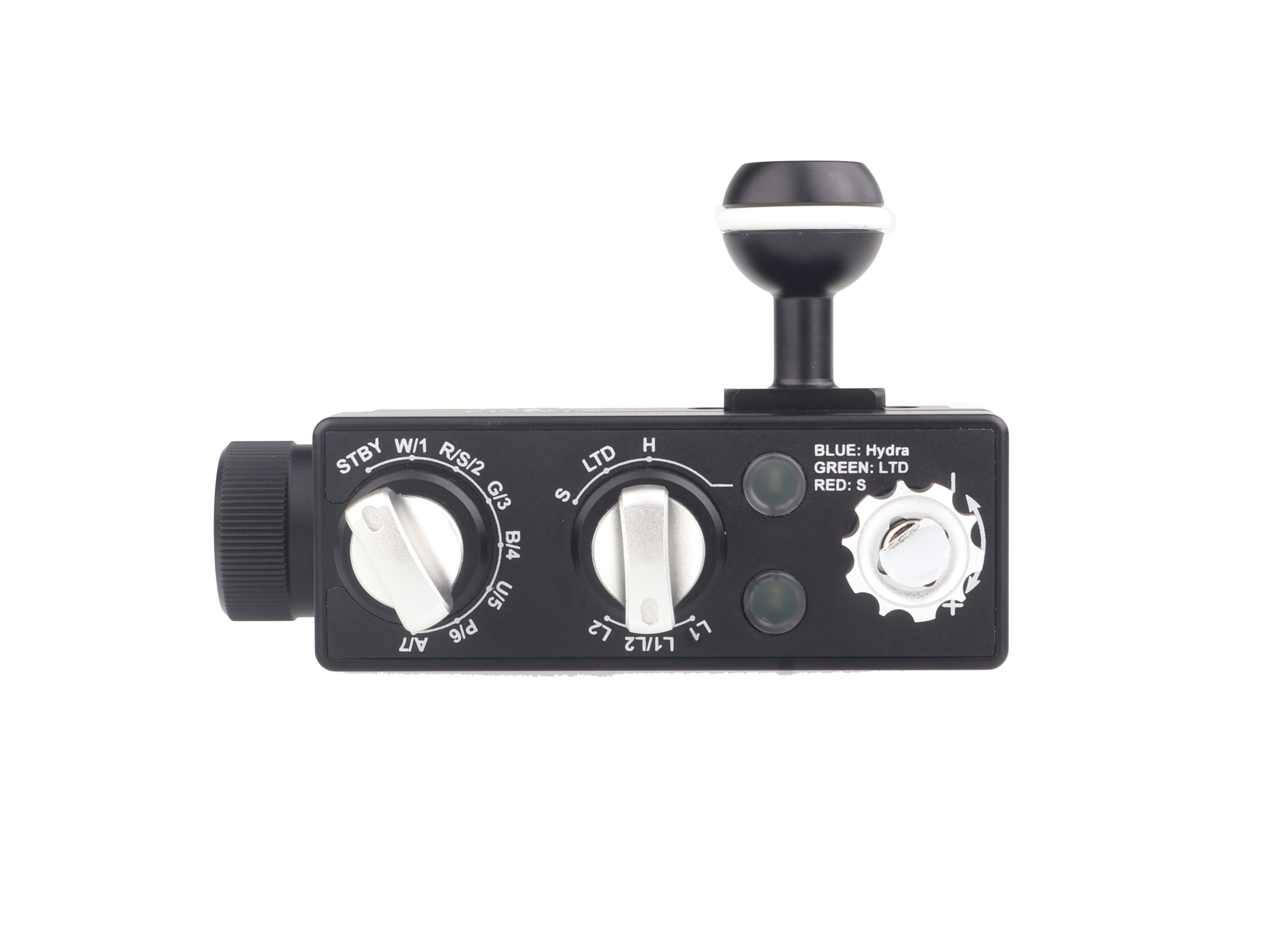Control remoto mediante cable de fibra óptica con botones sobredimensionados, fabricado en aluminio anodizado. Permite configurar el canal L1, el canal L2 o ambos a la vez. Para su uso, los focos deben estar en modo latente. El control muestra el estado de funcionamiento mediante luces LED: Azul (focos Hydra), Verde (focos LTD y Solar Flare Mini) y Rojo (Flash KR-S160/KR-S80). Utiliza una batería 18650 USB-C e incluye un indicador de estado de carga.