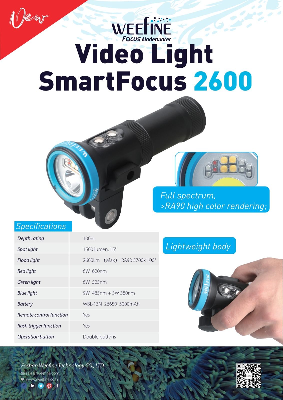 Foco dual para fotografía de Weefine, con 2.600 lúmenes de potencia en vídeo y 1500 lúmenes en haz concentrado. También dispone de modo flash. Smart Focus 2600 le ofrece 2600 lúmenes en modo vídeo con 110º de apertura, con 4 niveles de potencia en color blanco, 3 en luz roja (6W – 620nm), luz verde (6W 525nm), luz azul (9W – 485nm), color automático y 1500lm en haz concentrado de 9º. Incluye sistema de auto-apagado al detectar flash externo, conector óptico para control remoto y protección térmica inteligente.