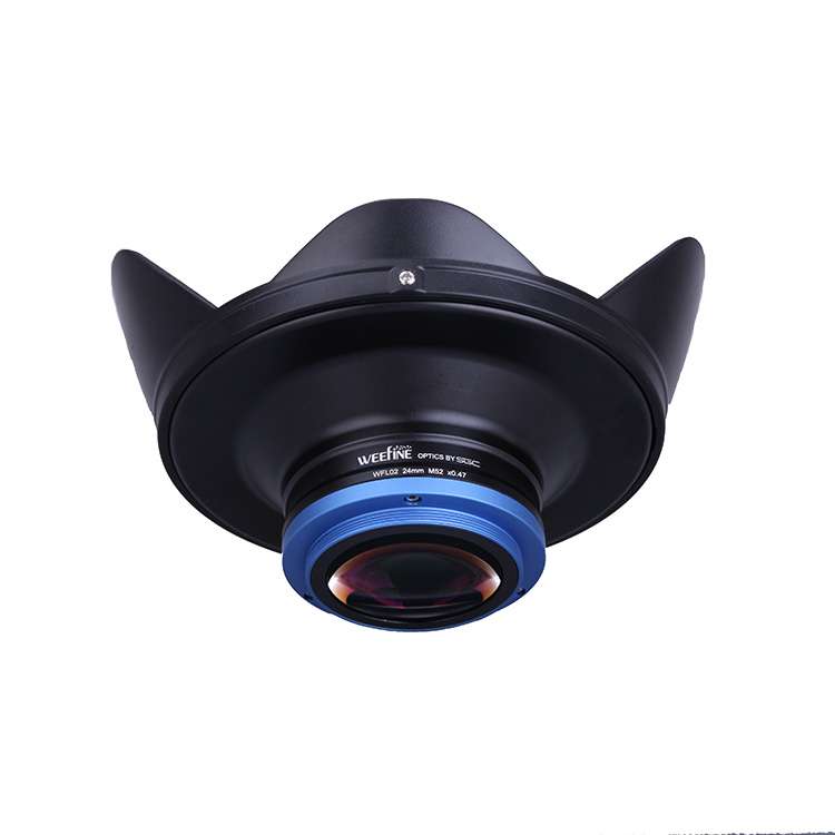 Lente Gran Angular de Weefine modelo WFL02, magnificación 0.47x, para cámaras con objetivo de 24 mm. Se puede poner y sacar bajo el agua y es compatible con rosca de métrica 52mm. Diseñada para cámaras digitales de Zoom largo, perfecta para la serie G de Canon. Construcción de 5 grupos y 5 elementos, cuerpo fabricado en aluminio anodizado del tipo II y cúpula en resina de policarbonato. Especificaciones técnicas: Magnificación de 0.47X, Rosca de 52mm, Medidas: 150 x 88mm, Peso: 690gr en tierra, Tratamiento hidropelente, Sumergible hasta 60m. Conversión del campo de visión: 24mm -> 150º, 28mm -> 127º, 35mm -> 103.6º.